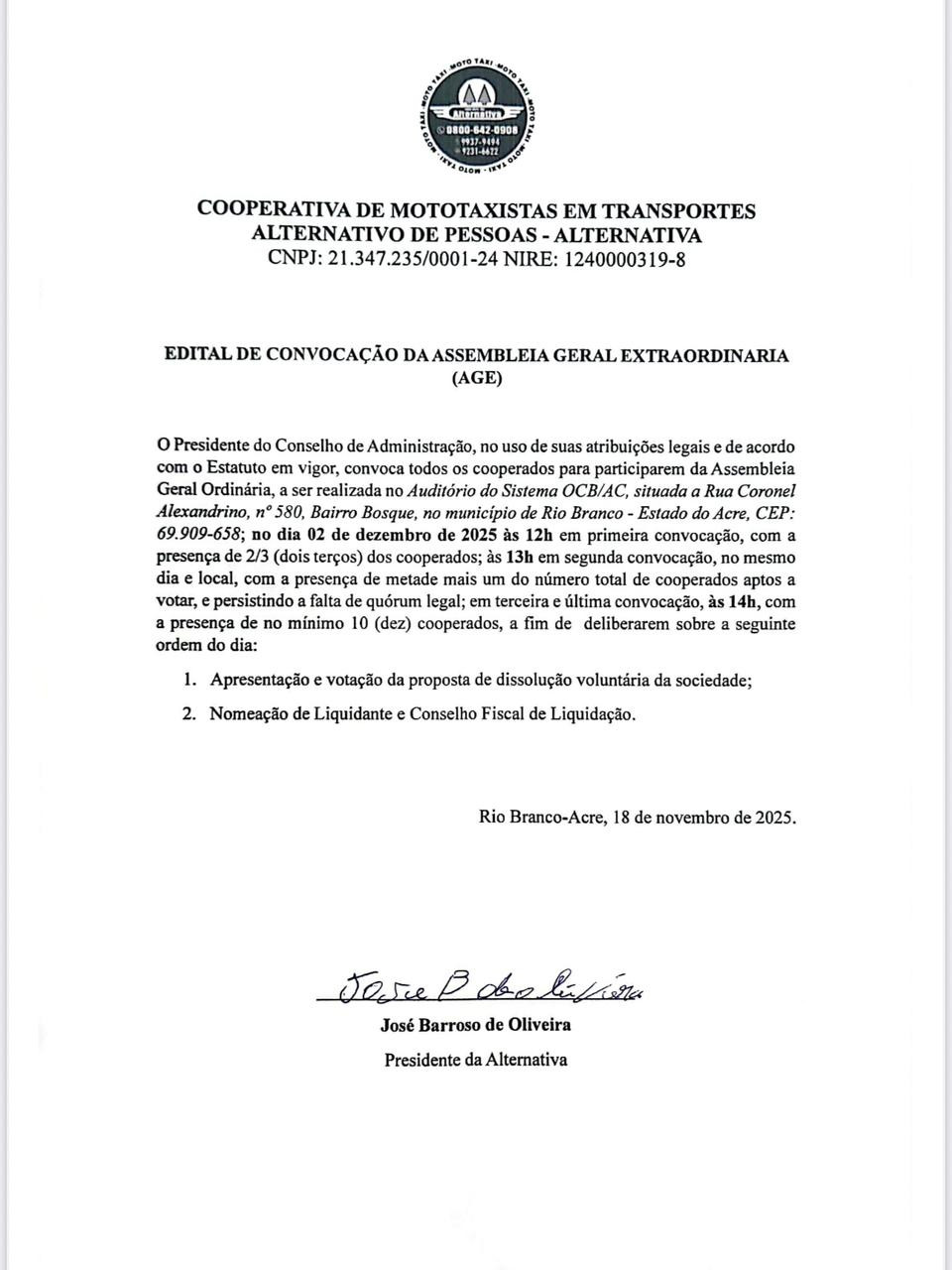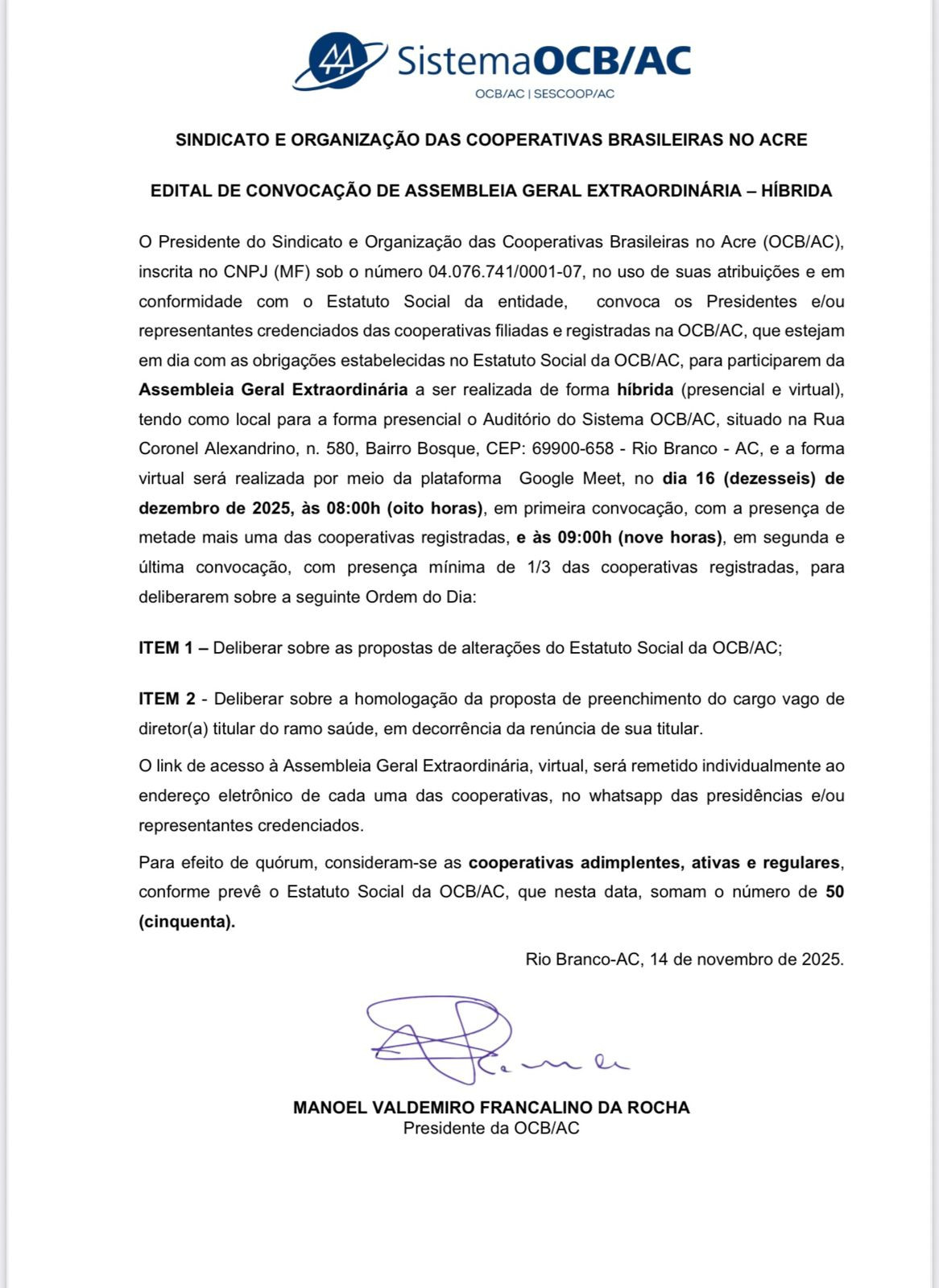 O Presidente do Sindicato e Organização das Cooperativas Brasileiras no Acre (OCB/AC), inscrita no CNPJ (MF) sob o número 04.076.741/0001-07, no uso de suas atribuições e em conformidade com o Estatuto Social da entidade, convoca os Presidentes e/ou representantes credenciados das cooperativas filiadas e registradas na OCB/AC, que estejam em dia com as obrigações estabelecidas no Estatuto Social da OCB/AC, para participarem da Assembleia Geral Extraordinária a ser realizada de forma híbrida (presencial e virtual), tendo como local para a forma presencial o Auditório do Sistema OCB/AC, situado na Rua Coronel Alexandrino, n. 580, Bairro Bosque, CEP: 69900-658 - Rio Branco - AC, e a forma virtual será realizada por meio da plataforma Google Meet, no dia 16 (dezesseis) de dezembro de 2025, às 08:00h (oito horas), em primeira convocação, com a presença de metade mais uma das cooperativas registradas, e às 09:00h (nove horas), em segunda e última convocação, com presença mínima de 1/3 das cooperativas registradas, para deliberarem sobre a seguinte Ordem do Dia: