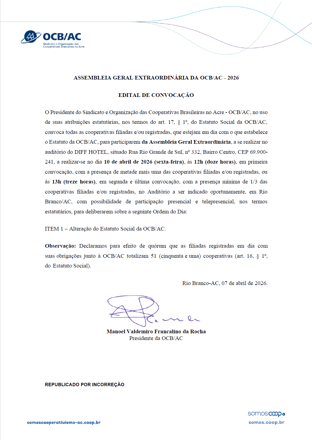 ERRATA - Edital de Convocação Assembleia Geral Extraordinária da OCB/Acre - 2026